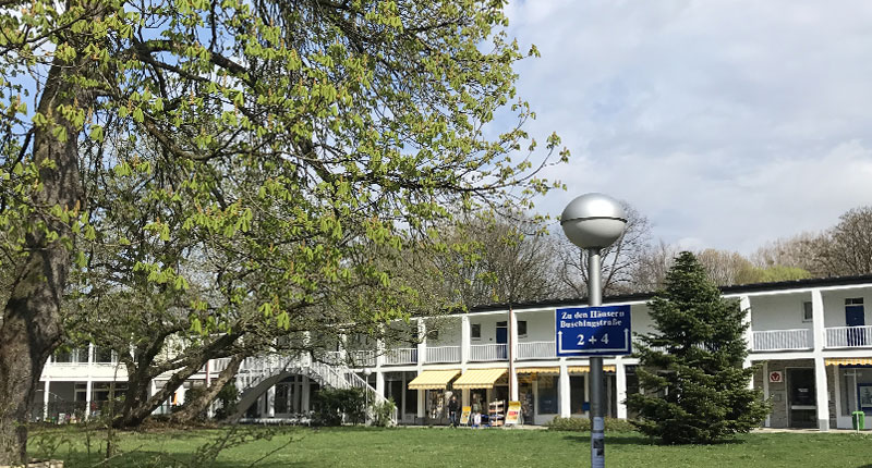 Buschingstraße 4 ist ein einstöckiges u-förmiges Wohnungs- und Geschäftsessemble rund um eine Grünanlage