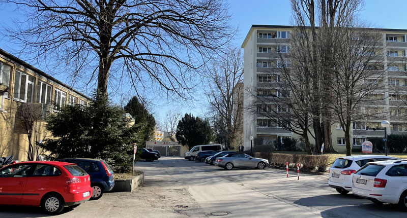 gegenüber der Bushaltestelle durch die Grünanlage geht es zu Fuß am kürzesten zur Buschingstraße; Foto aufgenommen vom Aufgang der U-Bahnhaltestelle Richard-Strauss-Straße