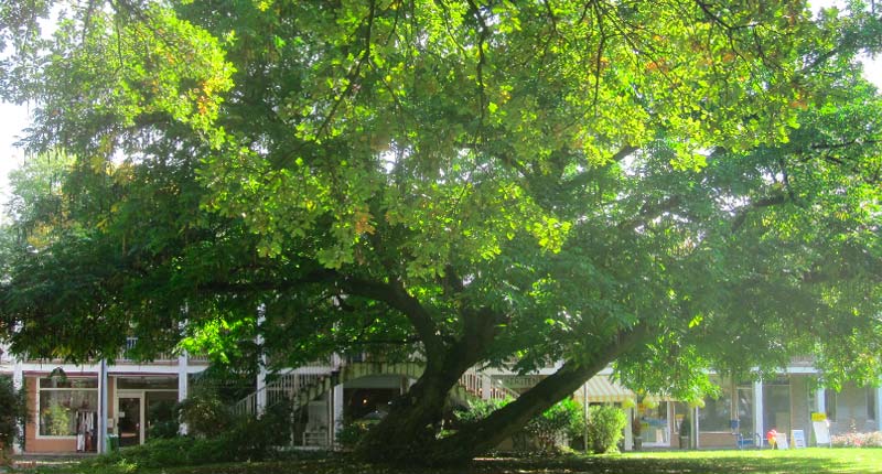 hinter Baum und Treppe liegt ebenerdig und barrierefrei die Praxis