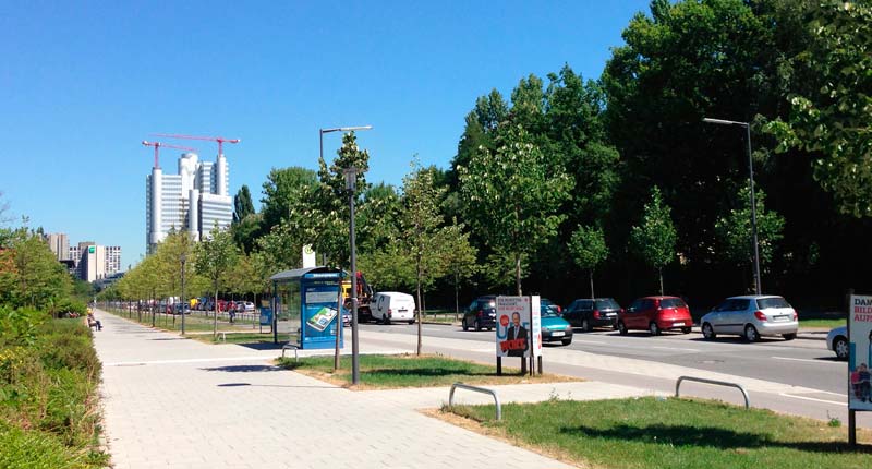 gegenüber der Bushaltestelle durch die Grünanlage geht es zu Fuß am kürzesten zur Buschingstraße; Foto aufgenommen vom Aufgang der U-Bahnhaltestelle Richard-Strauss-Straße